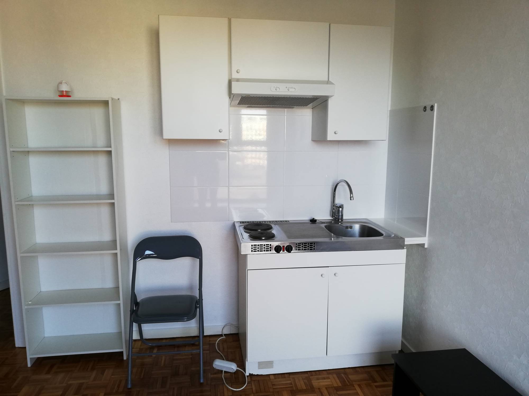 • une pièce de vie avec un coin cuisine équipée (rangements, hotte, plaque électrique, frigo).