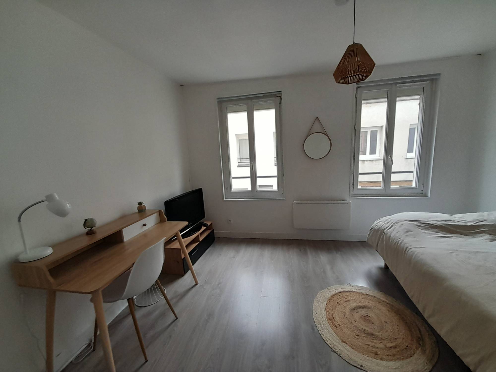 L'appartement est équipé d'un vrai lit deux places, une machine à laver, un espace travail et tout le nécessaire de cuisine.